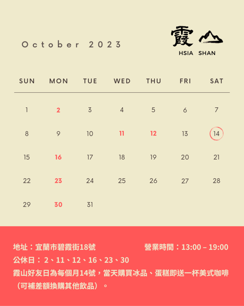 晚安!霞山十月份的營業日請大家參考👀✨雙十連假沒有休息,來宜蘭旅遊的時候歡迎來霞山走走!