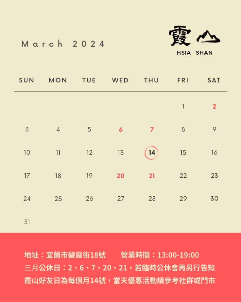 歡迎在營業日來霞山坐坐啊!